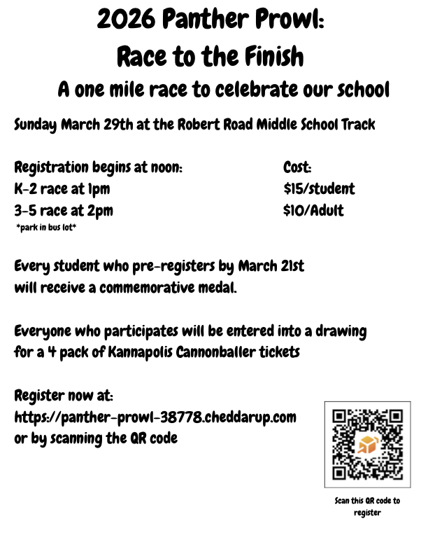 2026 Panther Prowl:Race to the FinishA one mile race to celebrate our schoolSunday March 29th at the Robert Road Middle School TrackRegistration begins at noon: K-2 race at 1pm Cost: $15/student3-5...