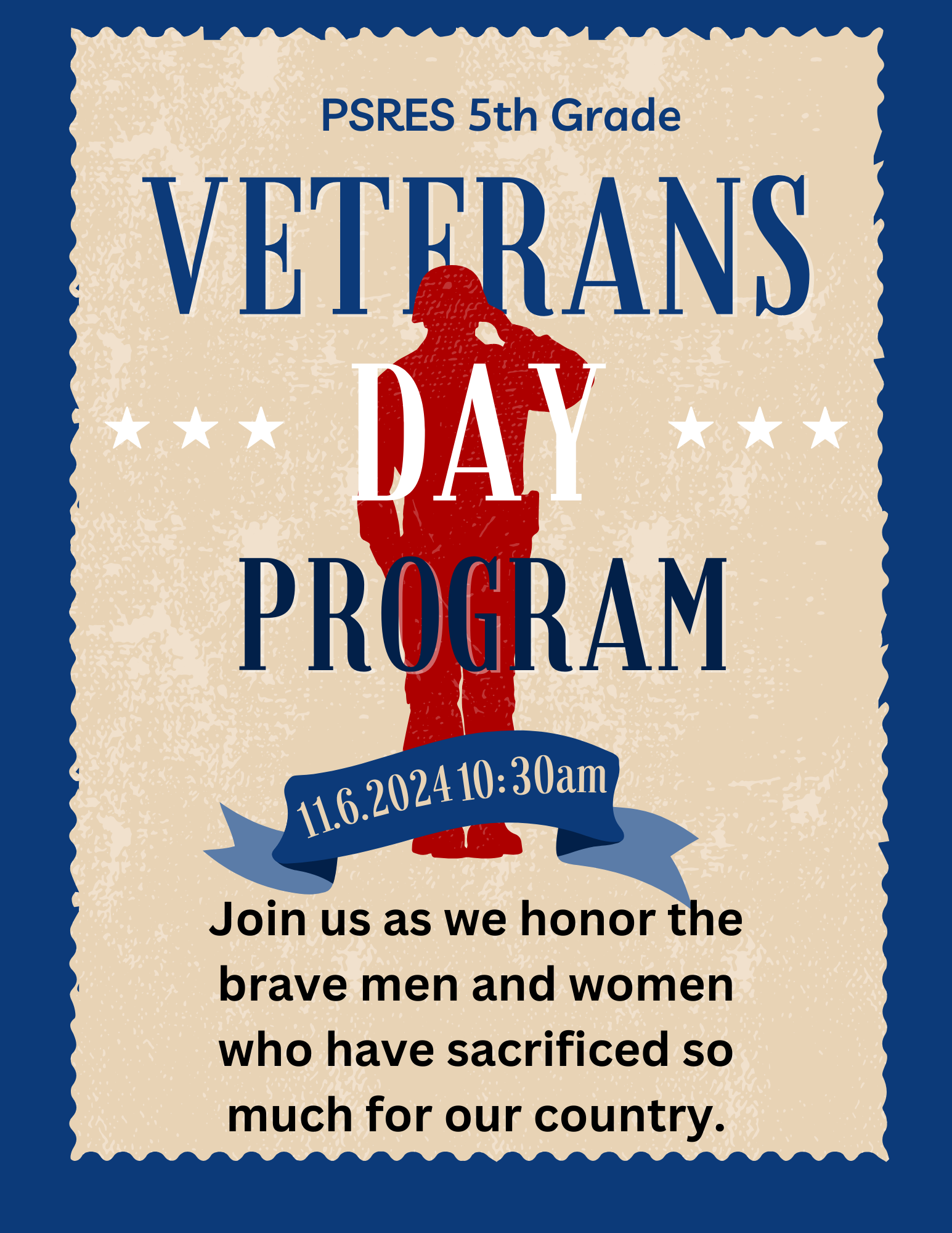 PSRES 5th Grade Veterans Day Program. November 16, 2024 at 10:30am. Join us as we honor the brave men and women who have sacrificed so much for our country.