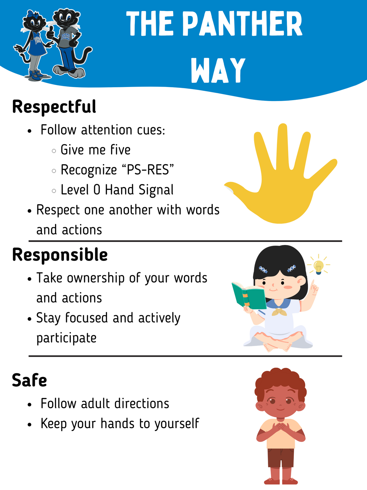This week we are reviewing The Panther Way!The Panther Way Respectful: Follow attention Cues Give me five Recognize "PS-RES" Level 0 Hand Signal Respect one another with words and actions Responsib...